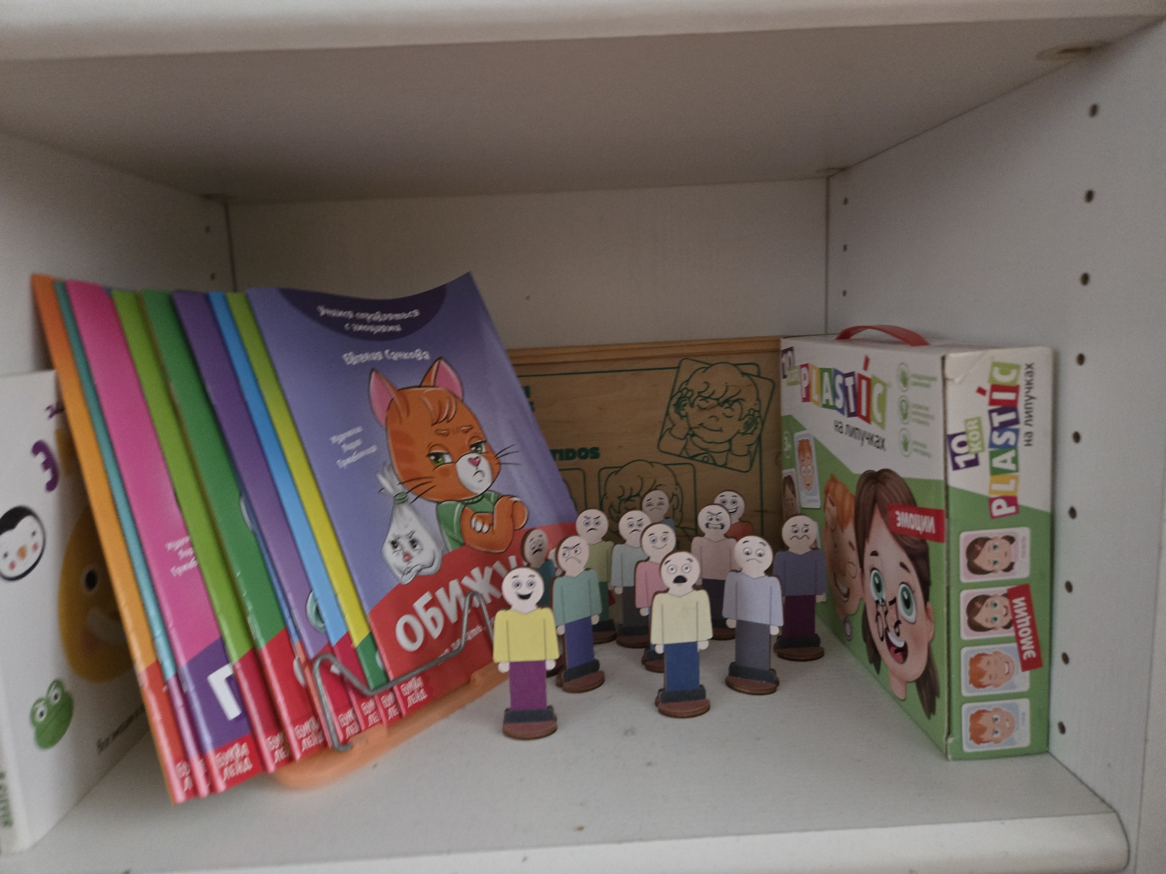 : 1. Познавательные книжки об эмоциях 2. игра на липучках "Эмоции" 3. фигурки эмоции 4. лото "Эмоции"